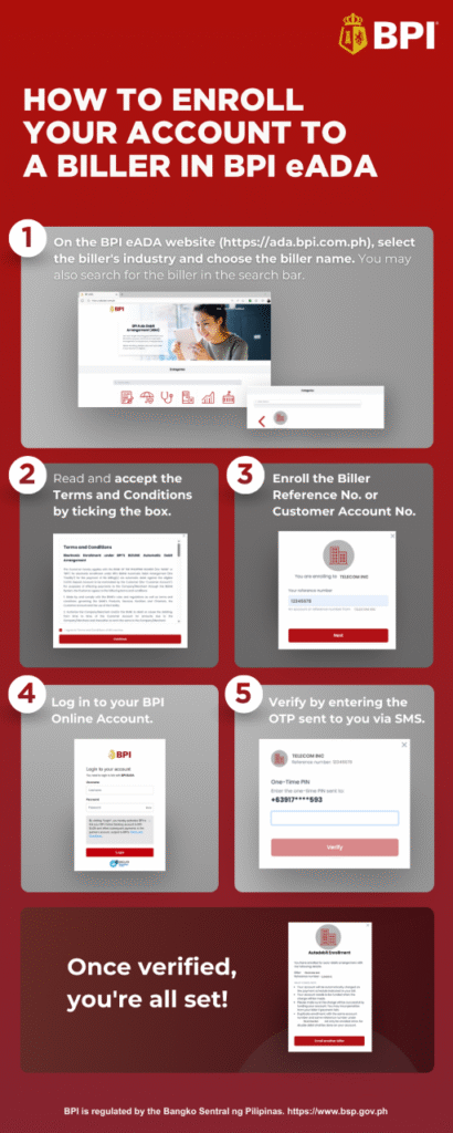 Set up your eADA today at https://ada.bpi.com.ph and enjoy hassle-free monthly payments.