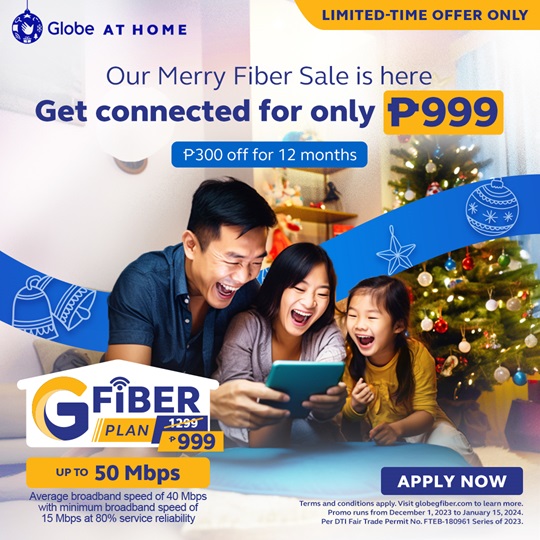 GFiber Plan 1299 is now available for just PHP999 for the first 12 months, giving customers savings of PHP 3,600 over one year. With this plan, you can enjoy internet speeds of up to 50Mbps, allowing you to play your favorite games, stream your much-loved shows, and snatch up the season’s best online deals! You can apply for this time-limited offer via globegfiber.com or visit any Globe Store nationwide from December 1, 2023 until January 15, 2024.