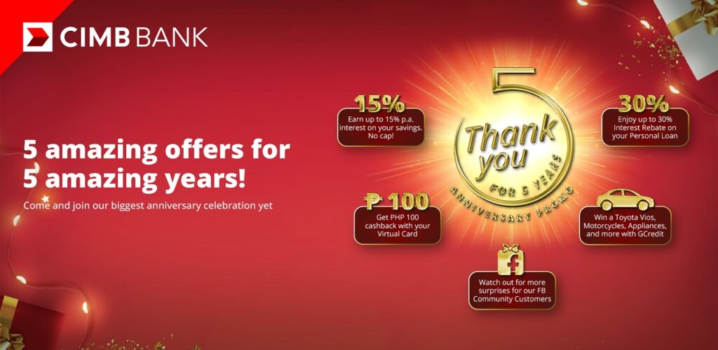 CIMB Bank Philippines marks its fifth anniversary with five amazing offers to thank its 7.5 million customers for their continued trust and patronage. This anniversary offer runs from November 1 to December 31, 2023,and is the Bank’s biggest customer appreciation blowout yet.