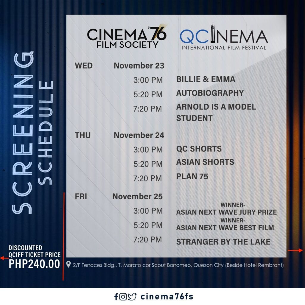 Tickets are priced at Php 240. This is a special discounted price for the QCinema International Film Festival movies that would be screened between November 23-25 only.