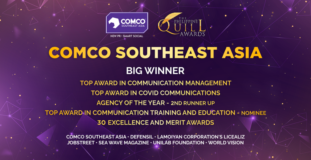 In total, COMCO Southeast Asia won an overwhelming number of 30 Quill Excellence and Merit Awards together with its partner brands in various industries and sectors such as JobStreet, Teleperformance, Lamoiyan Corporation’s Licealiz, Defensil, Unilab Foundation, and World Vision, as well as SEA Wave magazine, which made them the Agency of the Year 2nd Runner-up.