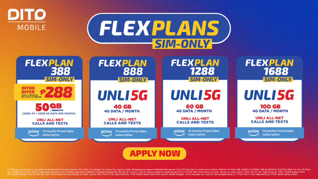 The new FLEXPlan 388 SIM-Only is DITO’s starter plan for individuals who want to start their postpaid journey. Customers can enjoy a total of 50GB of data; the usual 25GB plus an additional 25GB of 5G data, UNLI all-net calls & texts, and a bonus 12-month Prime Video subscription- all these with absolutely no lock-in period.