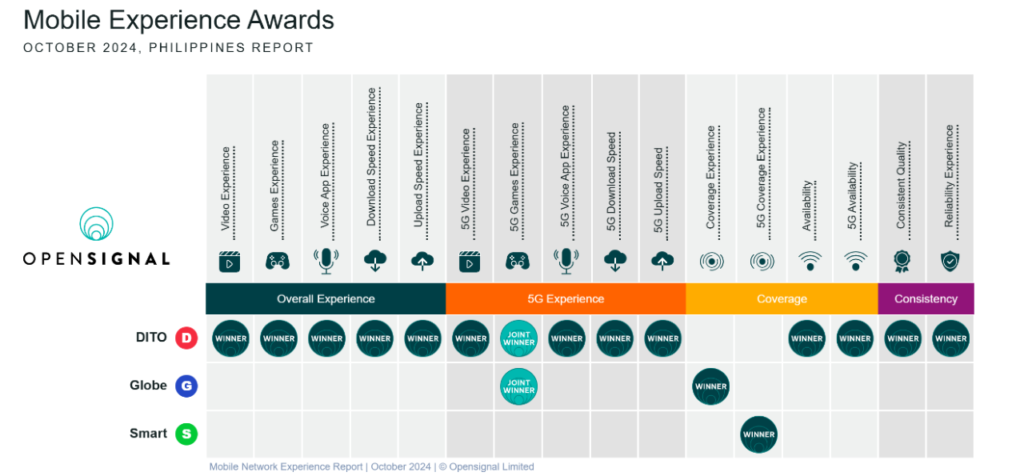 Based on Opensignal’s October 2024 Mobile Network Experience report, DITO dominated the awards and won in 14 categories, exemplifying the young telco as the country’s most awarded and fastest in 5G speeds and overall experience.