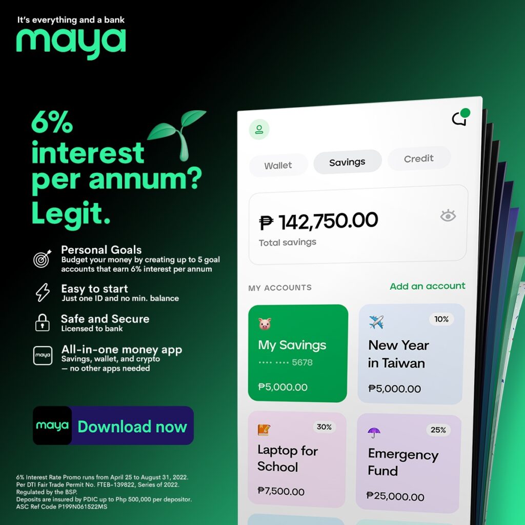 Under Maya Savings, you can easily set up to five active goals at a time and put a target amount and deadline of up to six months. The best part is that you can get a 6% interest rate on your Personal Goals savings for up to P1 million, per goal.