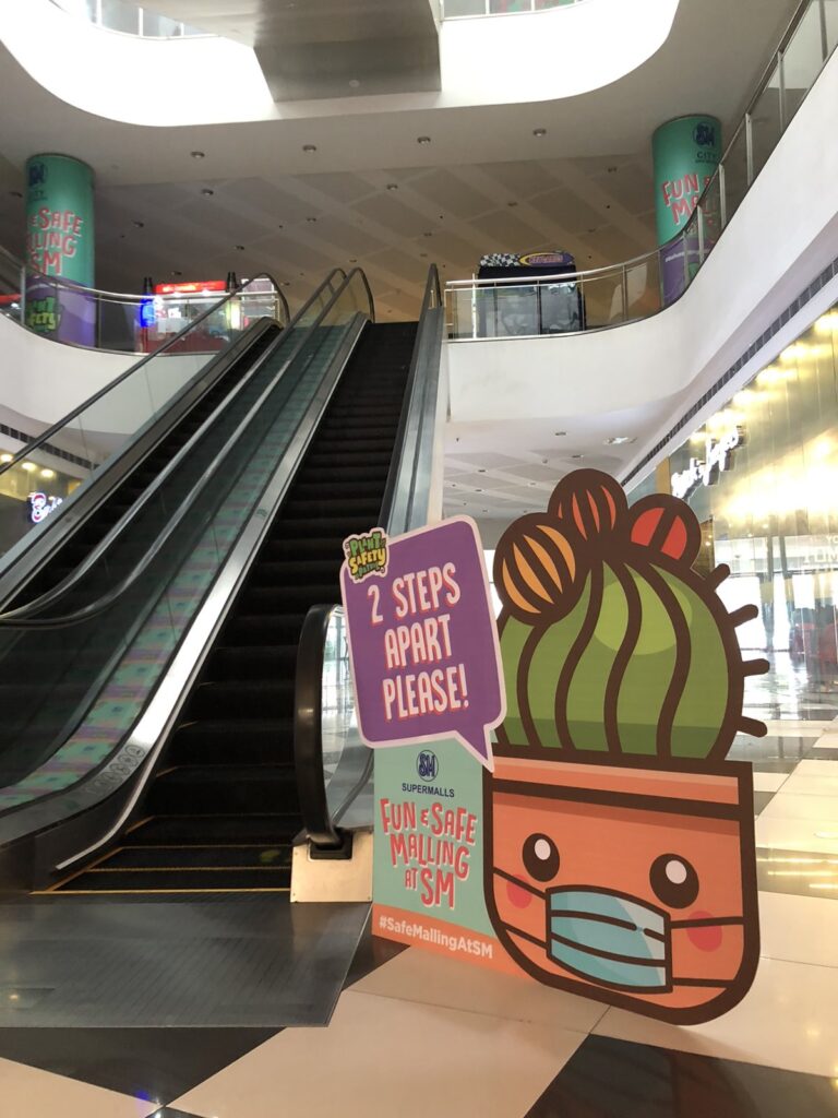 Cute cactus reminds to stand 2 steps apart on the escalator at SM City San Mateo