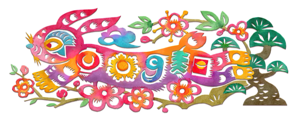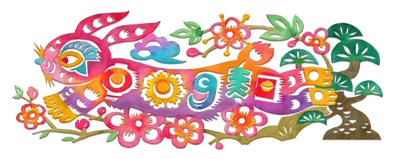 The Doodle features a running rabbit made from traditional paper cutting surrounded by plum blossoms (symbolizing endurance and hope), and a bonsai tree (symbolizing harmony and patience). Google is spelled out using lanterns, signifying a wish for a better future, and ang pao, the red envelope symbolizing a wish for happiness and blessings.