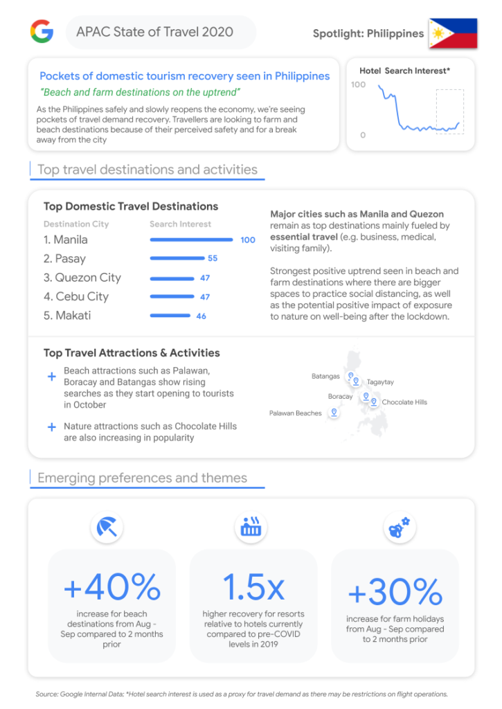 As the country safely reopens the economy, Filipinos are gaining confidence to book out-of-town staycations and are looking for farm and beach destinations, with 30% and 40% increase respectively, in Google Search queries from August to September. This is most likely due to the fact that these places have bigger spaces to implement physical distancing and the positive impact of nature to a person’s well-being after being in home quarantine. Beach attractions in Palawan, Boracay, and Batangas and nature attractions like Chocolate Hills in Bohol are among those being searched more often.