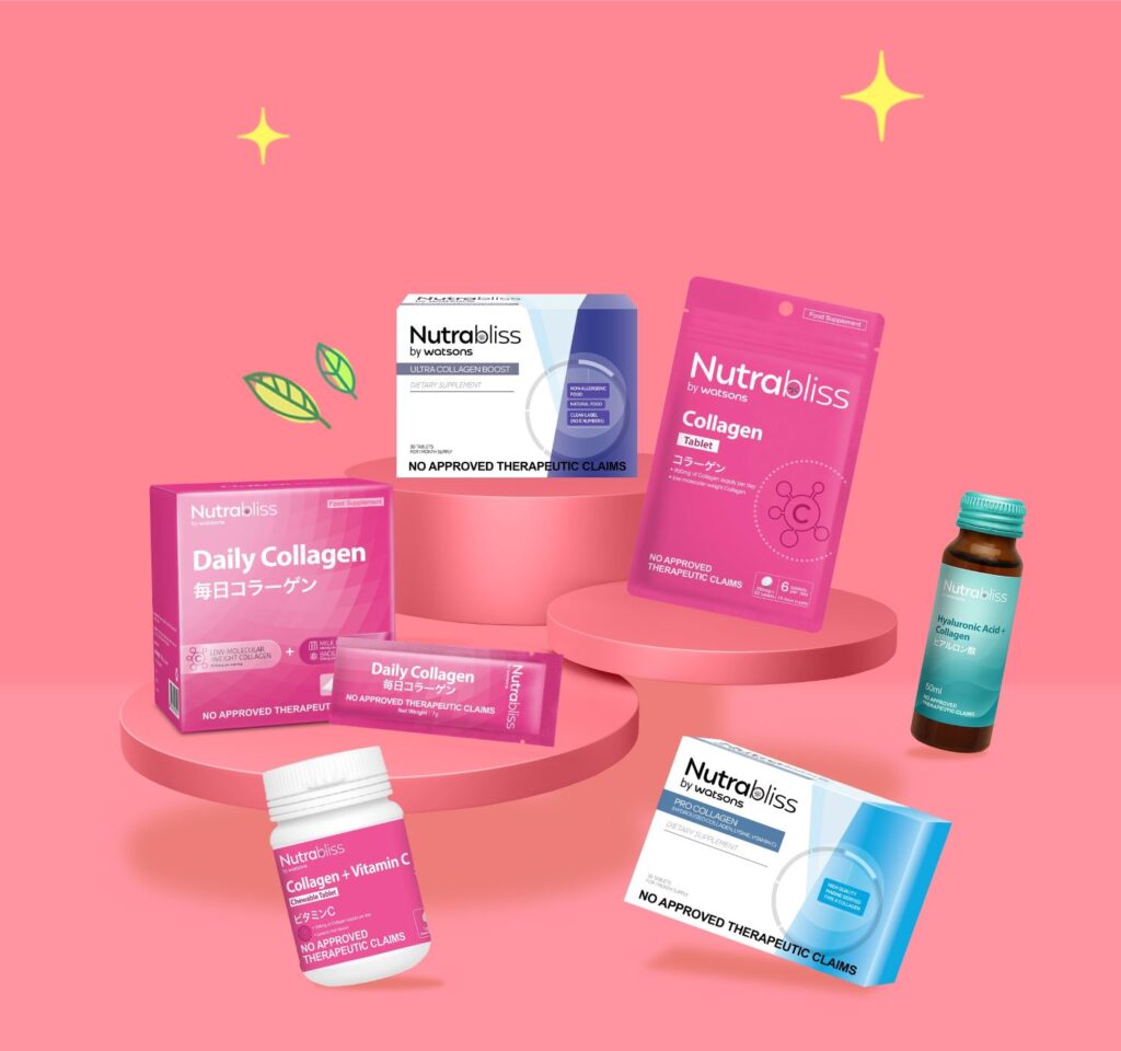 - Beauty and bliss. Watsons shows us the many ways to younger looking skin through its collagen products. There are chewables and tablets: Nutrabliss Collagen + Vitamin C which helps increase collagen production and Nutrabliss Collagen Tablets, which improve skin elasticity and firmness. These also come in sachet form like the Nutrabliss Daily Collagen Sachets, which you can add to your smoothie of choice;and low-calorie and high-absorption nighttime drink, Nutrabliss Hyaluronic Acid + Collagen, which helps keep your skin hydrated and moisturized.