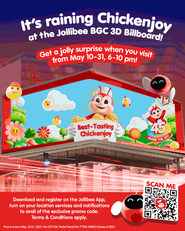 And to share the joy further on its 45th year, Jollibee will be giving away free 1-pc. Chickenjoy with Drink to people within the vicinity of the 3D Billboard! Customers just need to be registered users of the Jollibee App and have their location services and notifications turned on when they visit the Jollibee 3D Billboard from May 10-31, 6pm-10pm. Eligible customers will receive a push notification with an exclusive promo code, which can be used upon checkout on the Jollibee App. The promo is valid with a minimum order purchase of P450 and is applicable in Metro Manila, Bulacan, Cavite, Laguna, and Rizal stores for a limited time only – so hurry and head to the site to receive this joyful treat! It’s raining Chickenjoy – figuratively AND literally!