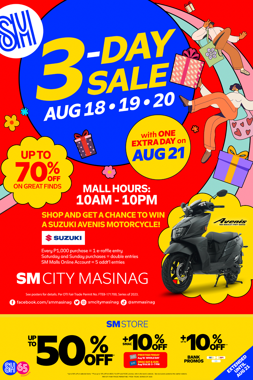 The best discounted deals are up for grabs at up to 70% off. Shoppers can get a chance to win a Suzuki Avenis motorcycle by joining an electronic raffle with a minimum single or accumulated receipt of P1,000 per DTI Fair Trade Permit No. FTEB 171700, Series of 2023