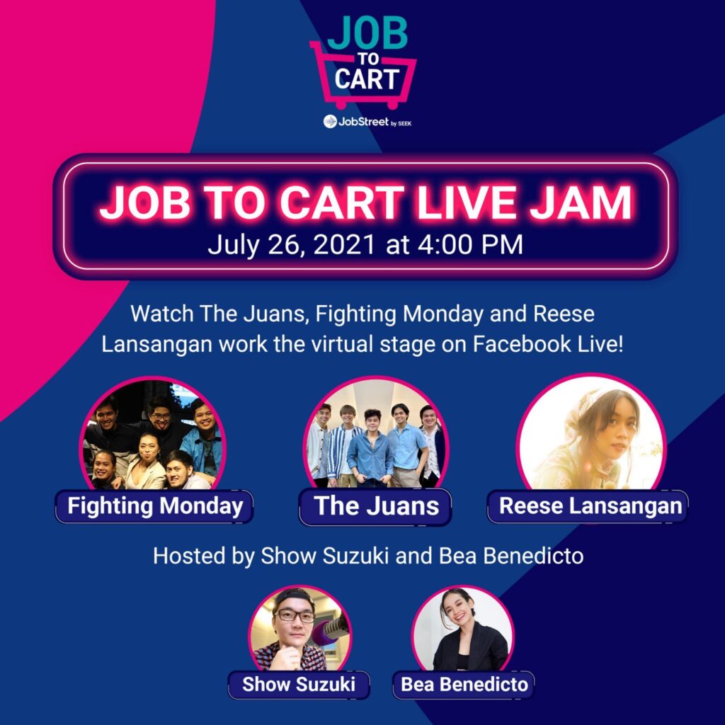 Candidates can also catch JobStreet’s Facebook Live Shows, featuring special musical guests Fighting Monday, Reese Lansangan, and The Juans. Guests will also talk about their experiences in job searching and working in an office. With the help of hosts Show Suzuki and Bea Benedicto, JobStreet will also present job vacancies that are up for grabs through “Job To Cart” during the livestream.