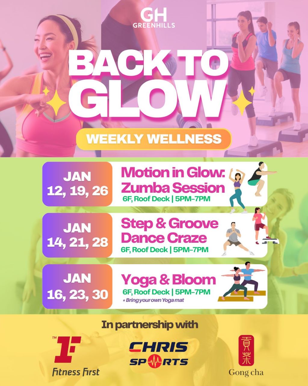 - Motion in Glow (Zumba): Light up the 6F Roof Deck every Monday (January 12, 19, 26) from 5:00 PM to 7:00 PM.