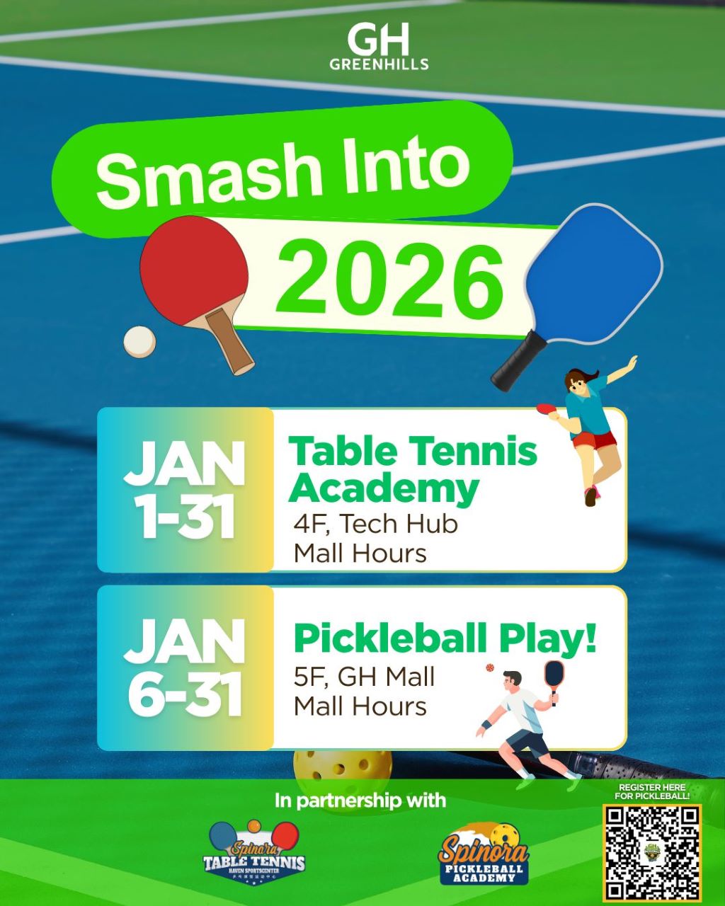 - Pickleball Play (until January 31, mall hours): Join the craze on the 5F and see what the pickleball hype is about.