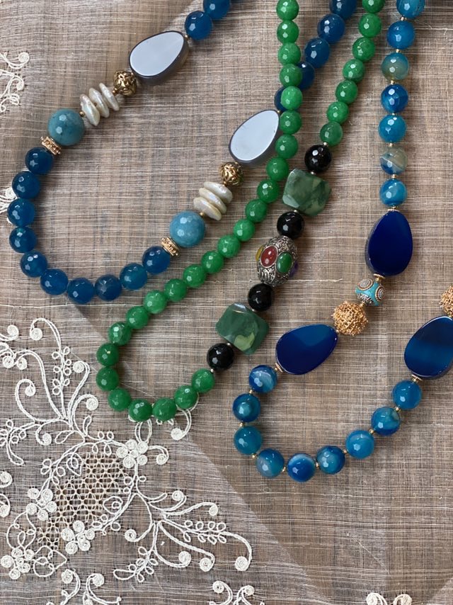 These semi-precious stone necklaces capture the colors of the deep blue sea and lush summer foliage.