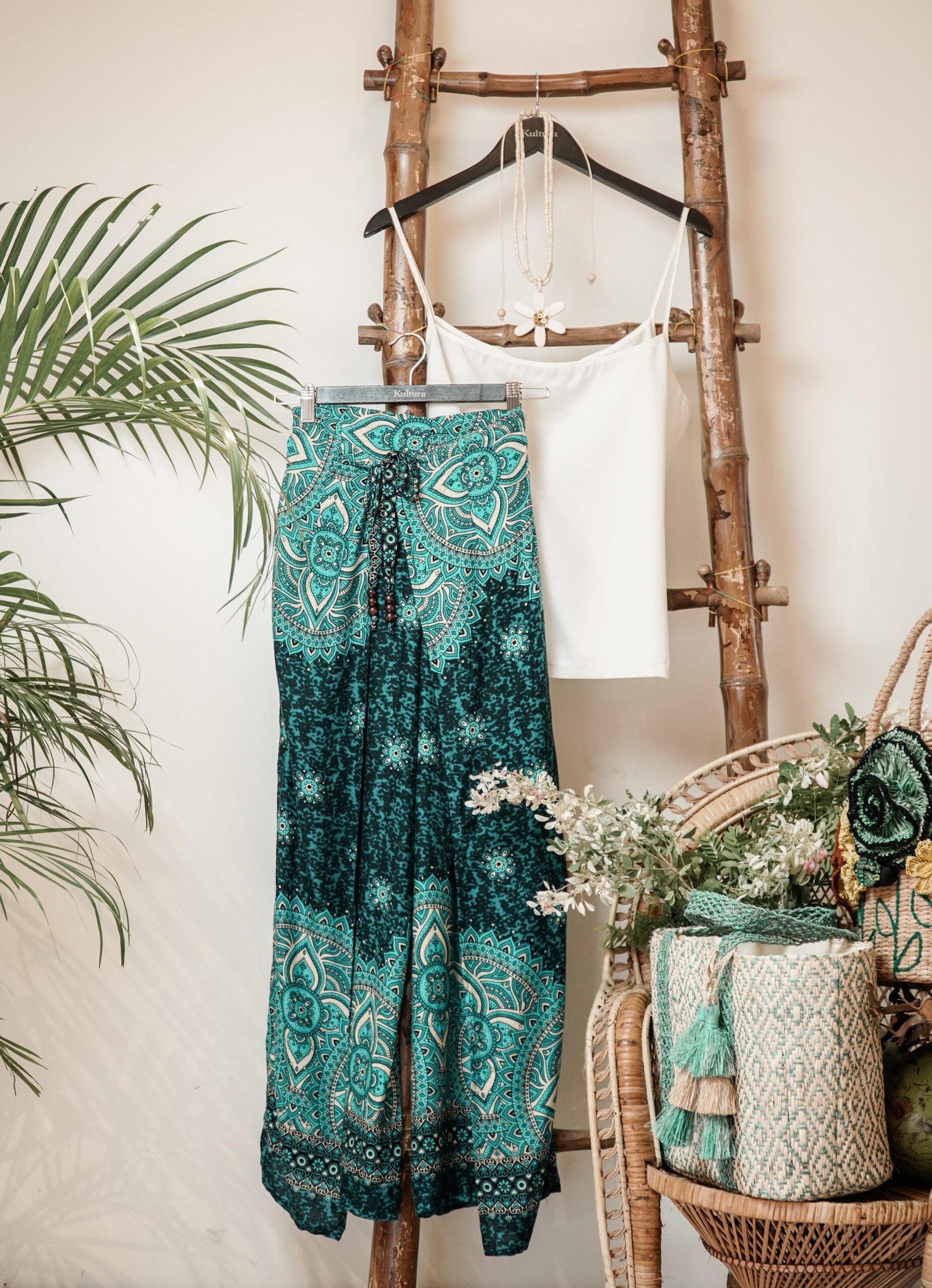 Get summer ready with Tropiko wrap pants with exotic tropical prints and a white tank top.