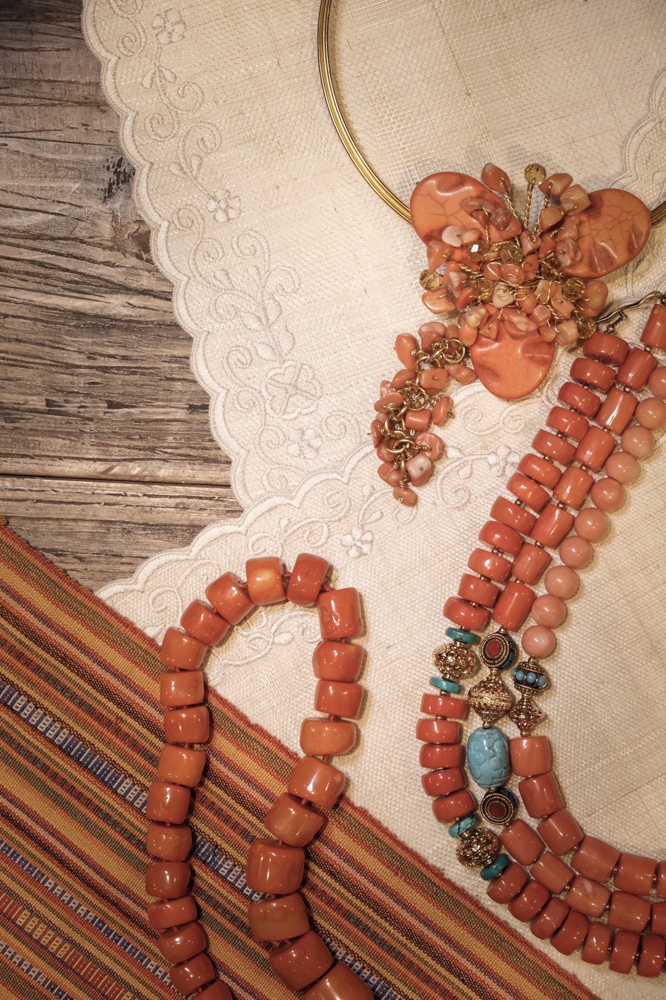 Go with the glow! Kultura’s semi-precious stone necklaces capture summer’s dazzling palette in tangerine and coral.