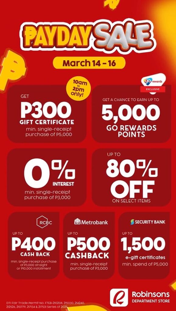 Don’t miss out on exciting deals and up to 80% discount on your favorite brands at Robinsons Department Store’s Payday Sale from March 14 to 16. For more updates, follow Robinsons Department Store on Facebook, Instagram, and TikTok.