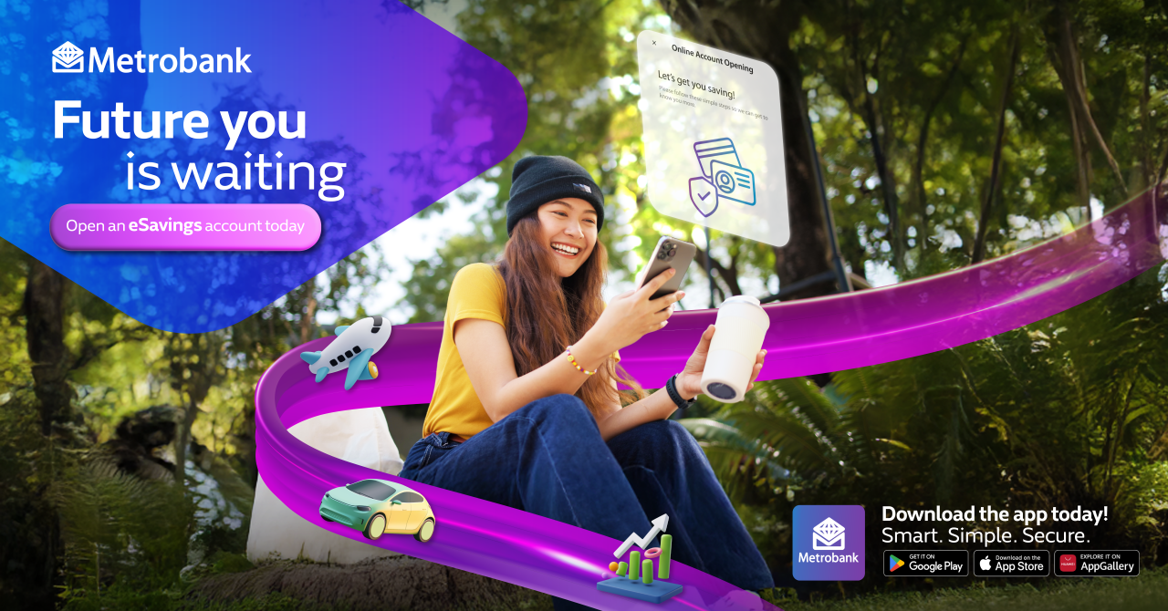 Make the move your future self will thank you for. Open a Metrobank eSavings account now via the Metrobank App— download it today on the Apple App Store and Google Play Store.