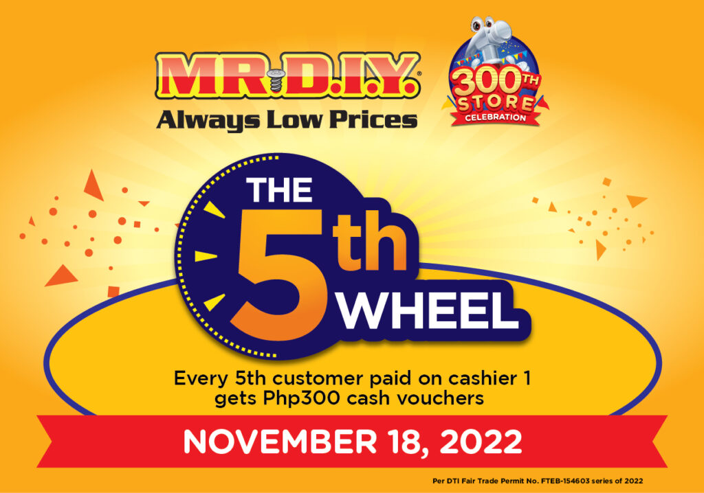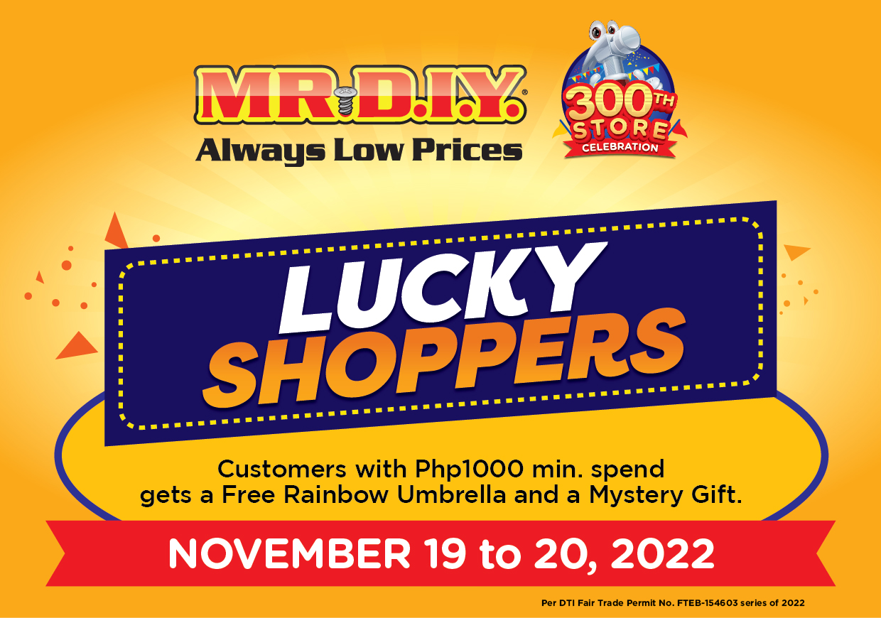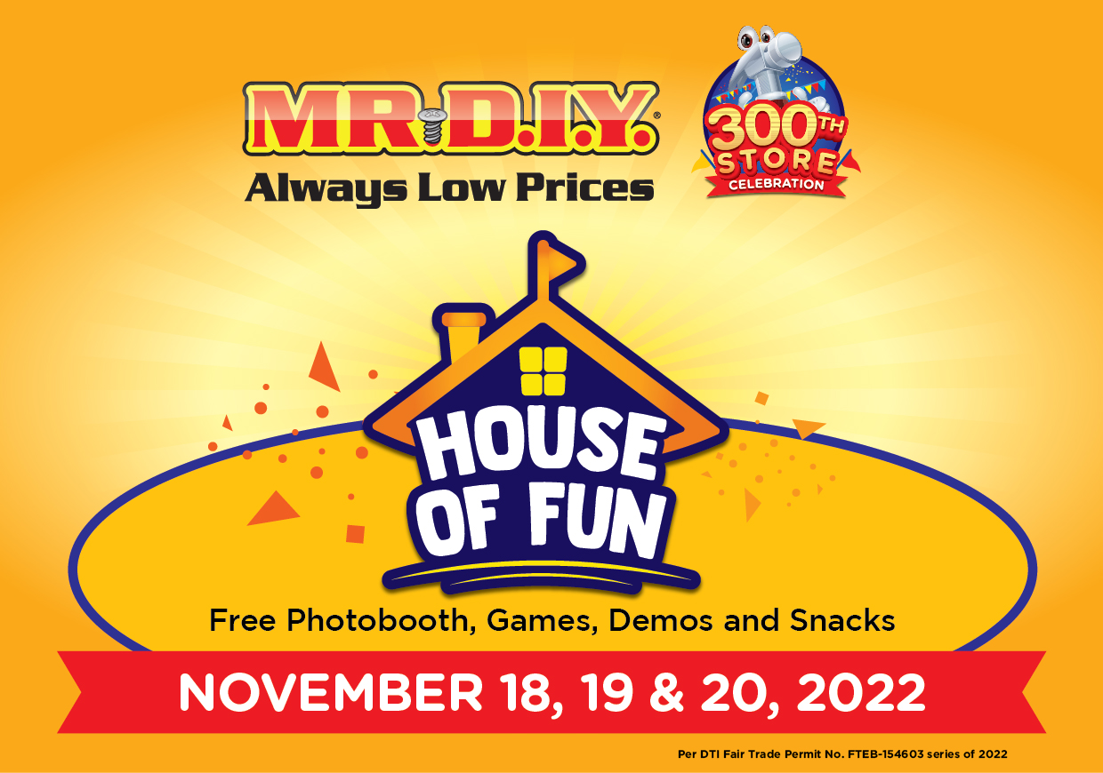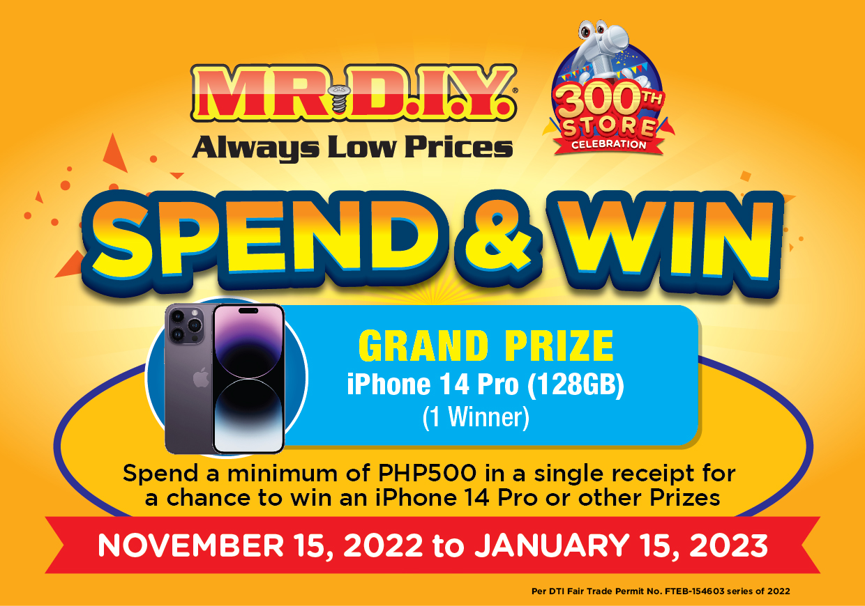 MR.DIY extends its 300th store milestone festivities ‘til the end of the year in all its stores nationwide. Cashless transactions from November 15 to 30 worth P600 and up are qualified for an instant MR.DIY voucher bonus. On top of that, one lucky winner with a single receipt worth PHP 500 can also take home a brand new iPhone 14 Pro Max. Shoppers just need to scan and register at their website. Promo will run from November 1 to December 31, 2022. Per DTI Fair Trade Permit No. FTEB-154605 S.2022.