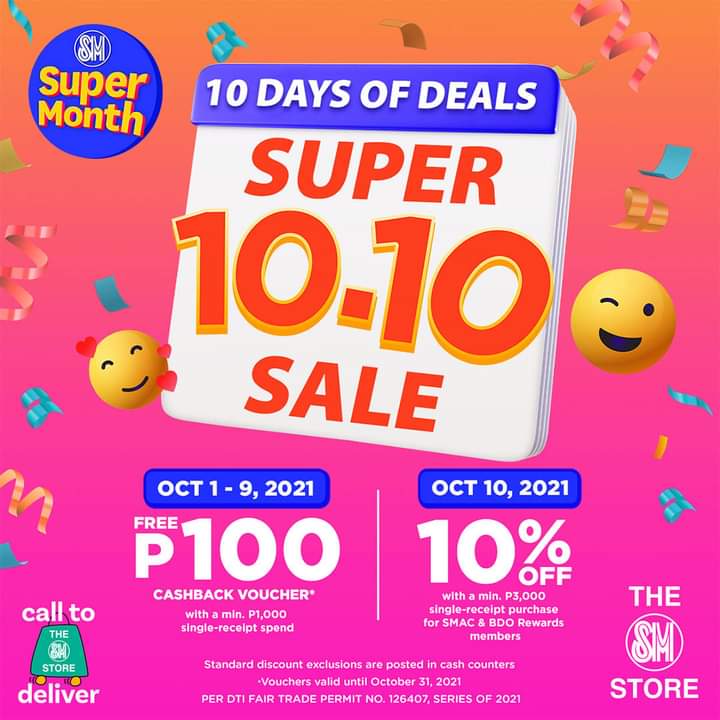 Super 10.10 Sale. Shop at The SM Store until October 9 and get a P100 super cashback voucher with a minimum P1,000 single-receipt purchase. On October 10, SMAC cardholders will be entitled to an extra 10% off with a minimum P3,000 single-receipt purchase. Ongoing until October 10 at all SM Store branches nationwide.