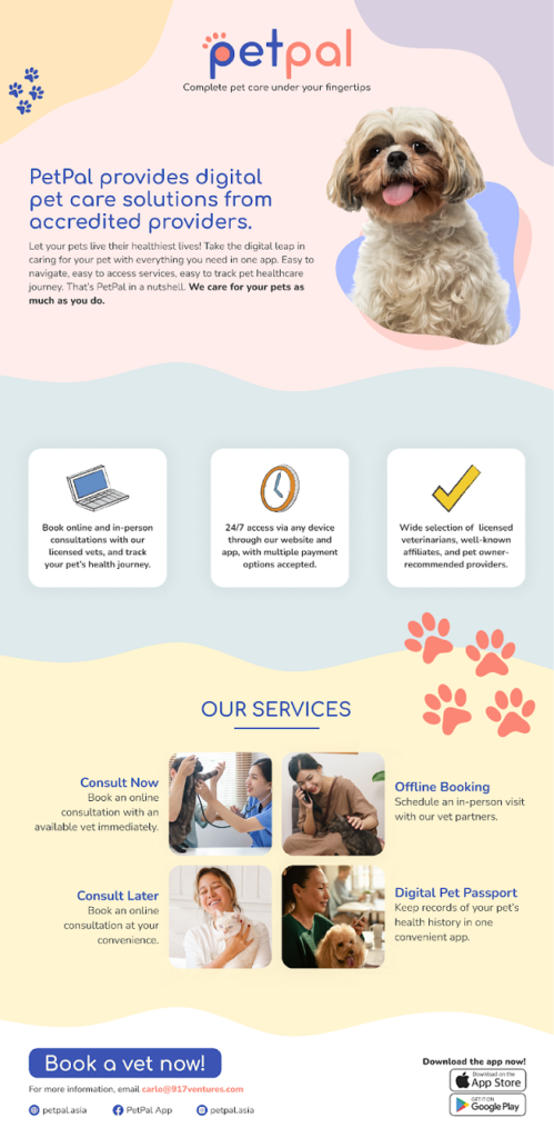 “The upcoming PetPal mobile app will further enhance the user experience by providing a one-stop-shop for all pet healthcare needs. With our innovative platform and strong network of veterinarians, we’re confident that PetPal will become the go-to solution for pet owners in the Philippines,” said Carlo Flordeliza, Venture Builder and 917Ventures Head of Growth.