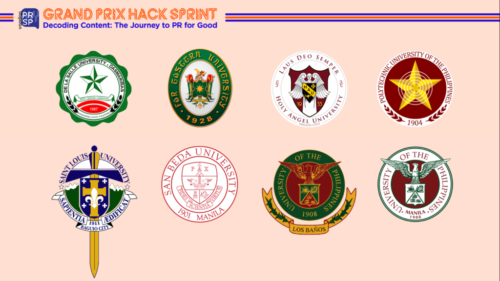 Eight (8) universities successfully advanced as qualifiers for the second phase, the Hack Sprint, where the students were given 24 hours to develop their communications plan. These are De La Salle University – Dasmariñas, Far Eastern University, Holy Angel University in Angeles, Pampanga, Polytechnic University of the Philippines, San Beda University, Saint Louis University in Baguio, University of the Philippines – Los Baños, and University of the Philippines – Manila.