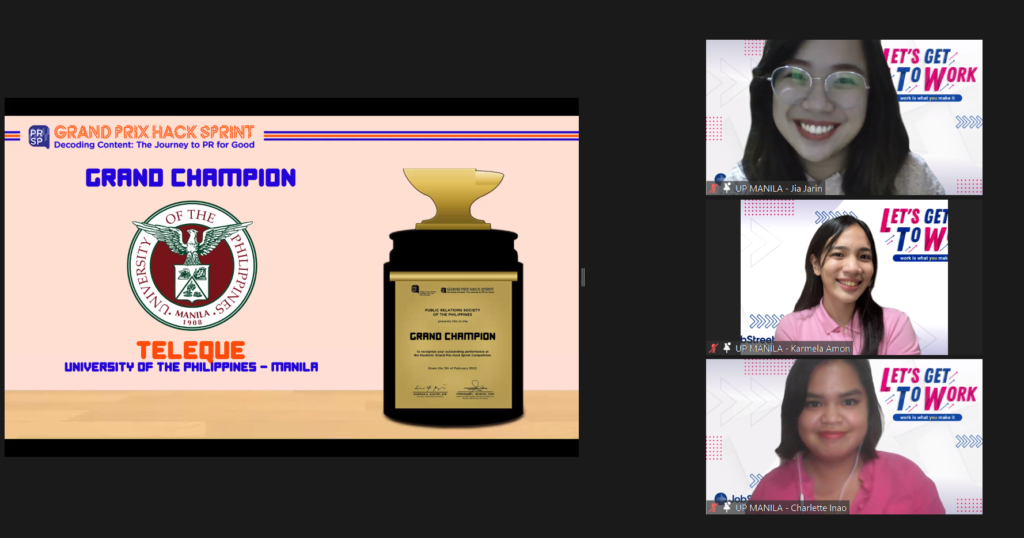 The winning team from UP Manila, comprised of Jia Jarin, Karmela Amon, and Charlette Inao, expressed their gratitude for the exciting opportunity to be part of this year’s Grand Prix, albeit virtually.