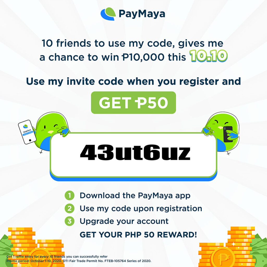 Just in time for 10.10, PayMaya is making it more rewarding to share the joys of going cashless for you and your family. From now until tomorrow, you and your friends will get P50 each when they register to PayMaya using your referral code. On top of that, PayMaya is also raffling off P10,000 worth of credits for 10 lucky PayMaya users who will get 10 referrals by 10.10 (October 10). Here’s how you can refer your friends to PayMaya: