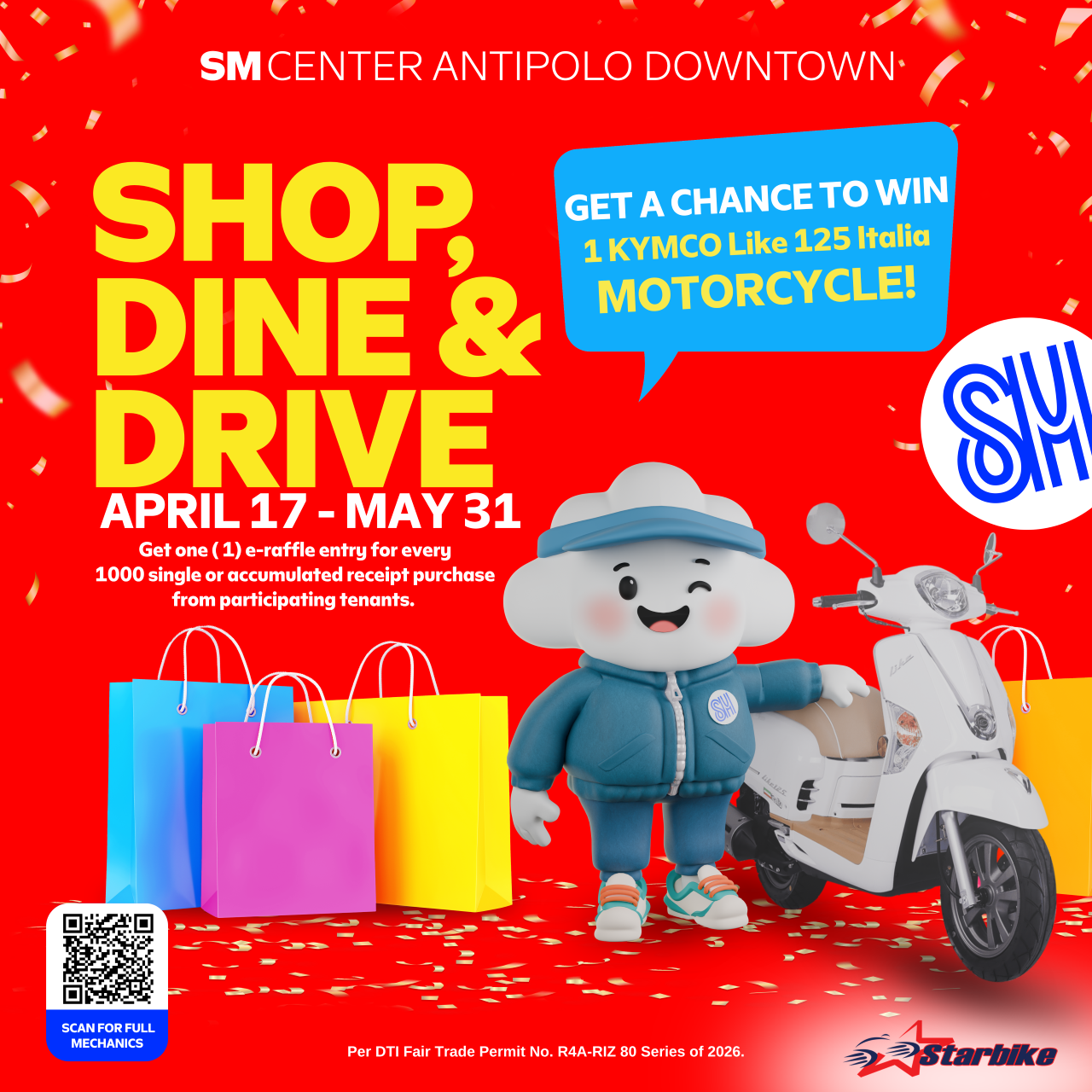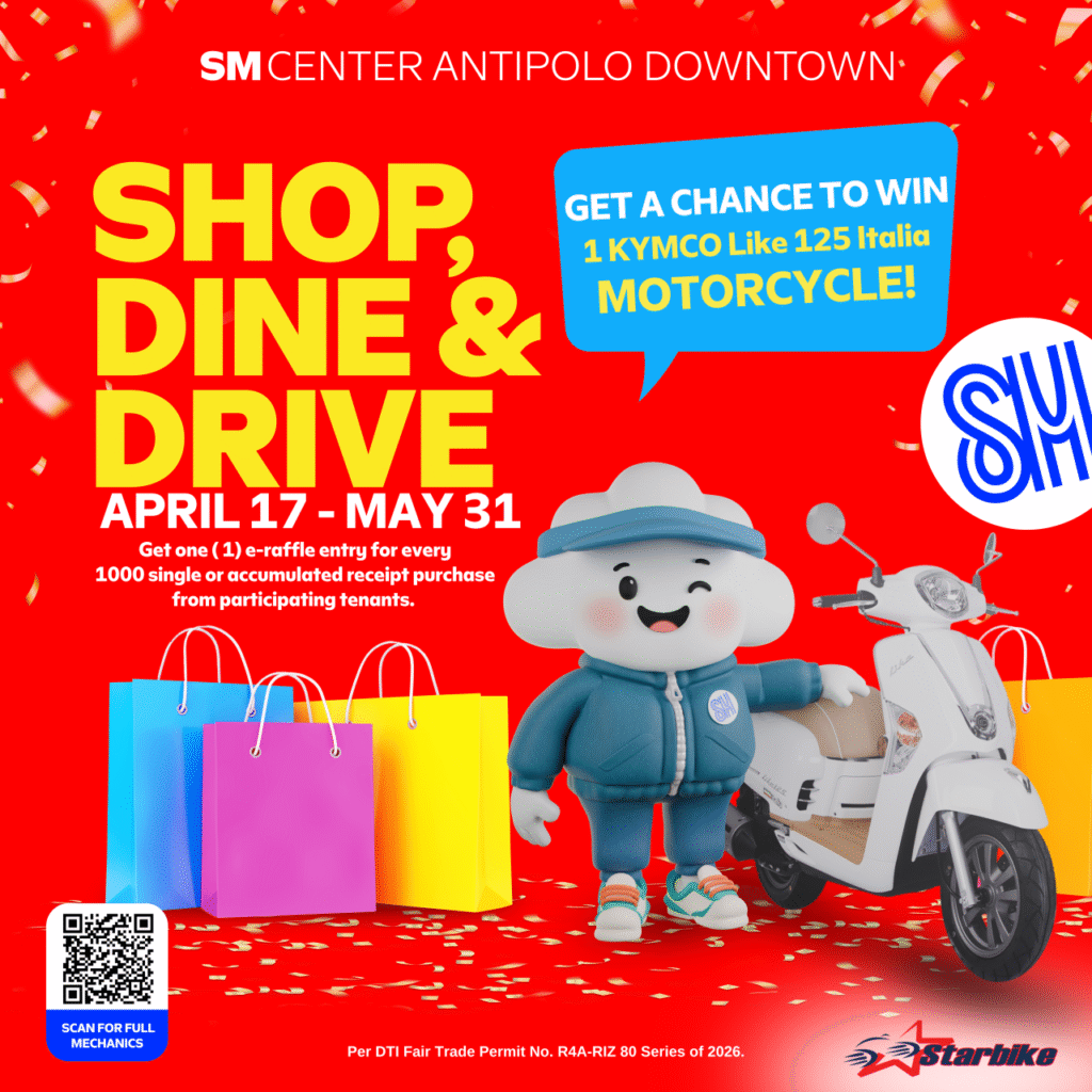 For every ₱1,000 single or accumulated purchase from participating tenants within the promo period, customers receive one (1) e-raffle entry as part of the ongoing promo in partnership with Starbike.