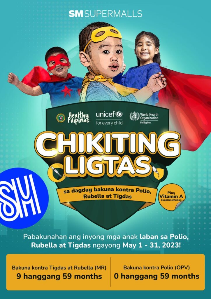 SM Supermalls, in partnership with the Department of Health (DOH) launches the Chikiting Ligtas Measles-Rubella and Oral Polio Vaccine Supplemental Immunization Activity (MR-OPV SIA) on May 01-31, 2023 in 60 SM malls in cooperation with Healthy Pilipinas, United Nations International Children’s Emergency Fund (UNICEF), and the World Health Organization (WHO).