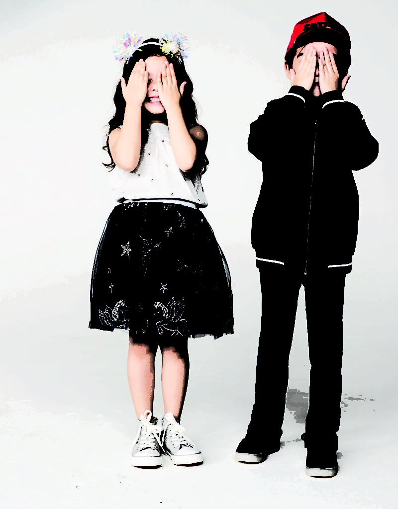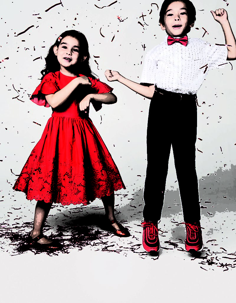 Nothing gets the kids more excited than unwrapping the goodies under the tree. They’re dressed in holiday style – in a shimmery halter top and tulle skirt with glittered embroidery for her and a bomber jacket and pants on him