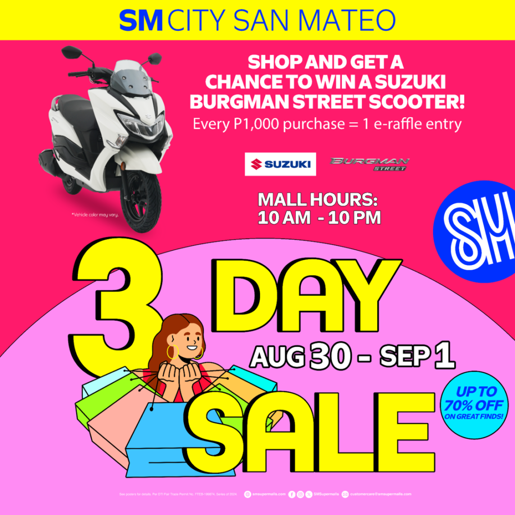 Don’t miss out on this amazing opportunity to update your wardrobe and enjoy incredible savings! Visit SM City San Mateo from August 30 to September 1 and experience the ultimate shopping adventure.