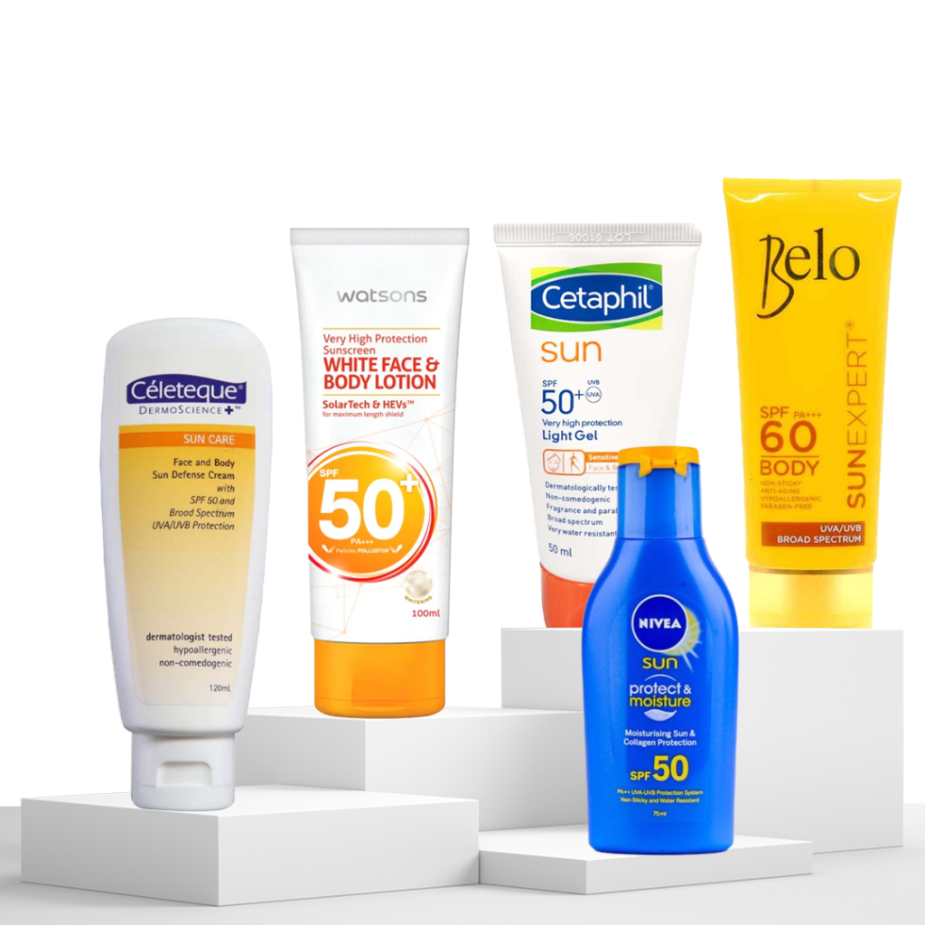 - Whether you’re indoors or outdoors, sunscreens are essential! Be prepared with an arsenal of sunscreen, so your skin stays protected. Belo Sun Expert Body SPF60, Cetaphil Sun SPF50+ Light Gel, Celeteque Skin Defense Tinted Face Stick, and Watsons Very High Protection Sunscreen White Face & Body Lotion SPF 50+ PA+++.