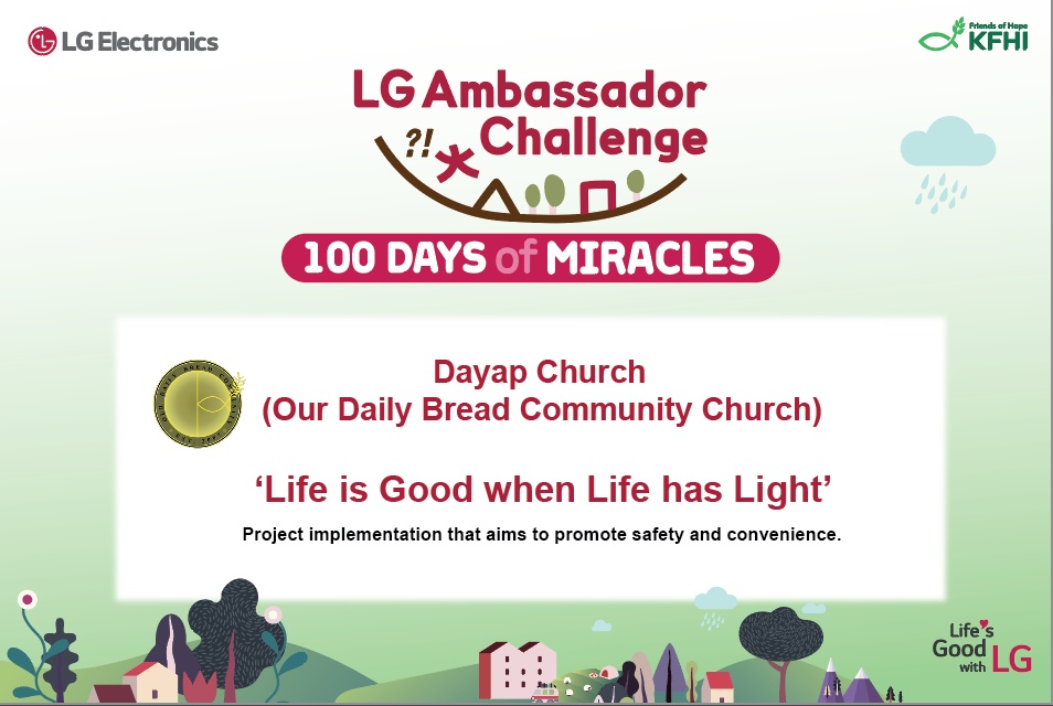 ‘Life is Good, When Life Has Light’ is a program spearheaded by the Our Daily Bread Community-Dayap Church. The community, based in Calauan, Laguna, is a relocation site provided by the government after typhoon Ondoy. In the barangay, streetlights are practically absent, which makes it a dangerous place come night time, both for pedestrians and drivers alike. To address the problem, solar-powered street lights will be established throughout the dark places inside the relocation area. This goal will help people feel safe, reduce crime, conserve energy, make streets clearly visible in order to promote safety and convenience, and to have safer, comfortable, more convenient, and more efficient movement of vehicles during nighttime.