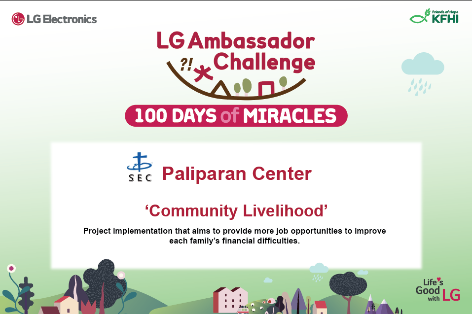 The third winner for this year’s LG Ambassador Challenge is the Paliparan Community Livelihood Project by Bong Rho Yoon. The proposal aims to alleviate the livelihood of the community living in Paliparan, a dense barangay of over 100,000 people, most of which are urban poor. There are approximately 1,000 families living in the area with over 50% of the households’ main income coming from construction work. To help alleviate their situation, the livelihood project aims to introduce sewing to add job diversification. The vocational training education hopes to increase employment and add a stable source of income for households.