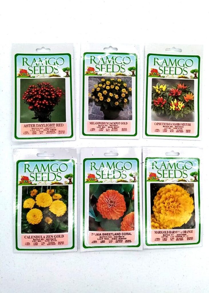 Let your garden bloom with Ramgo Flower Seeds: Aster Daylight Red, Melampodium Jackpot Gold, Capsicum Maya Mambo Mixture, Calendula Zen Gold, Zinnia Sweetland Coral and Marigold Harmony Orange.