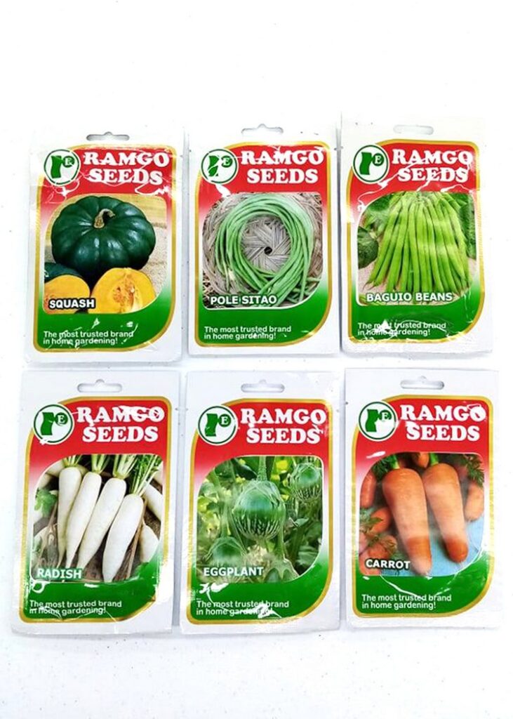 Ramgo Vegetable Seeds: squash, pole sitao, baguio beans, radish, eggplant and carrot.