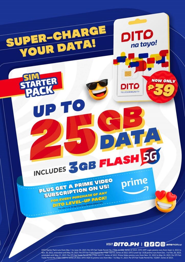 To encourage more Filipinos to try its high-speed data and value-for-money products, youngest telco player DITO Telecommunity now offers its DITO SIM Starter Pack with up to 25GB all-access data for only Php 39! New subscribers can also enjoy a bonus 30-day Amazon Prime Video mobile subscription for every purchase of any DITO Level-Up Pack!