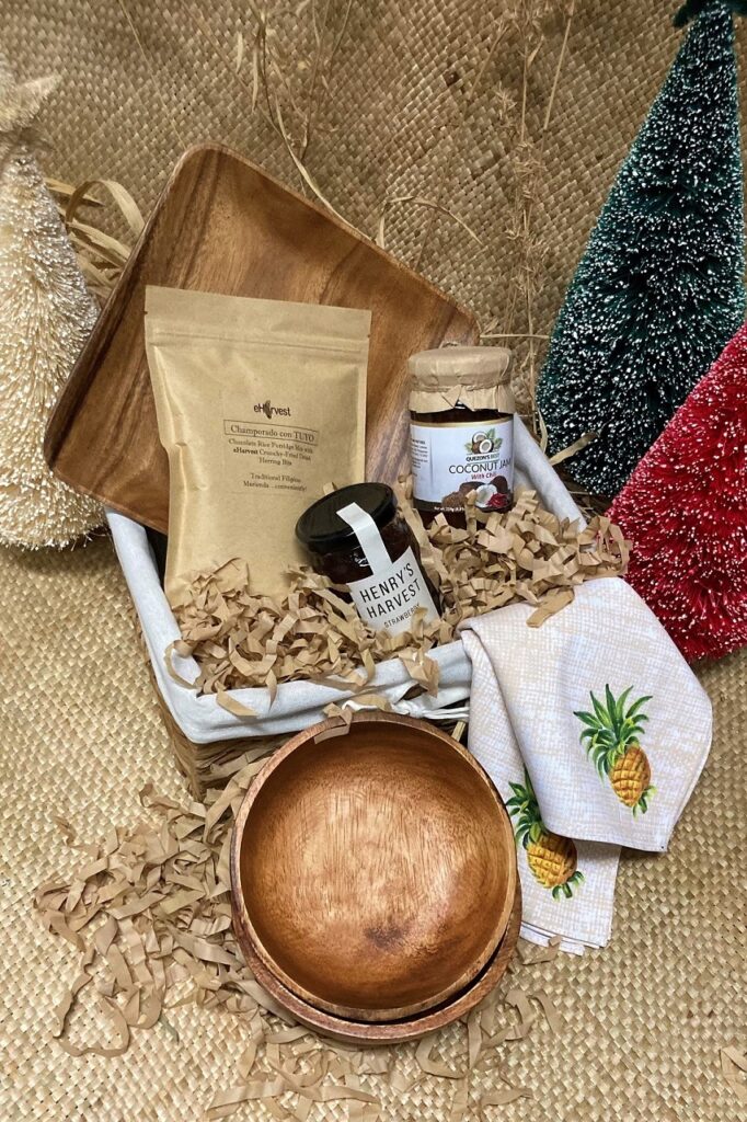 • Something Comforting. Classic champorado, coco and strawberry jams, acacia bowls and plates from Pampanga plus a pair of handprinted napkins make a delightful gift set that celebrates s Pinoy snack time with a dose of nostalgia.