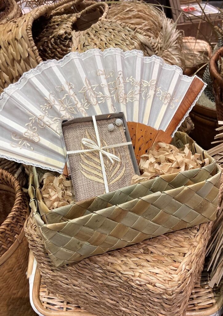 • Something Stylish. Embroidered fans, jute coin purses, and beautiful shawls all wrapped in pandan boxes.