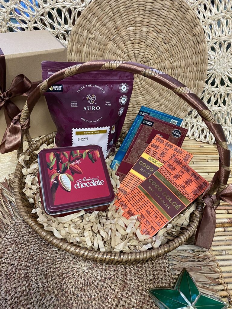 • Something Decadent. Say it sweetly while supporting the local cacao industry with a basket full of chocolates from Davao. This bundle includes an assortment of dark and milk chocolates from Malagos, tree-to-bar chocolates from Auro, and Coco low-glycemic variants using coco sugar from Coco Dolce.
