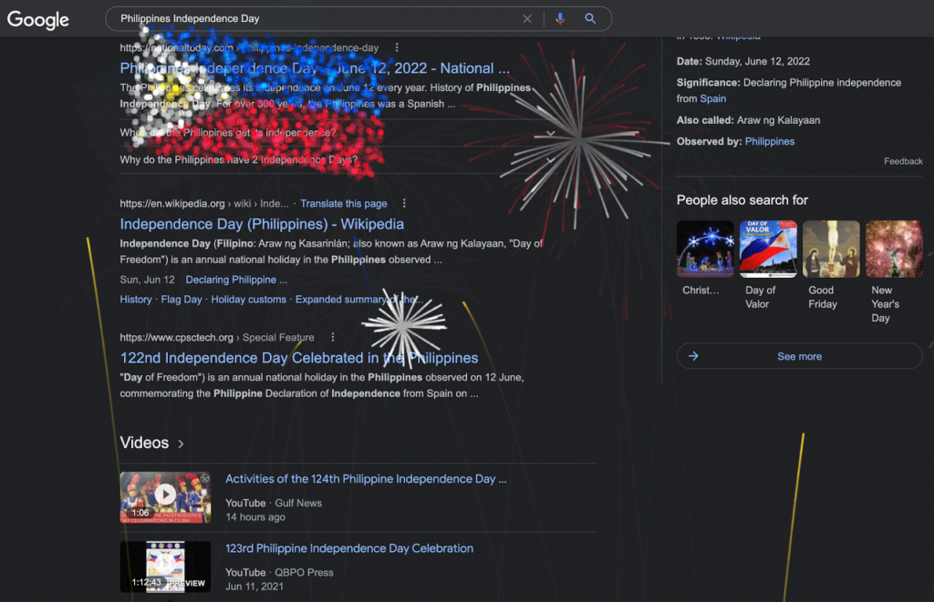 Manila, Philippines, June 12, 2022 – Google has planted an Easter egg in Search results to celebrate the 124th Philippine Independence Day. It has also released an animated Doodle on its Search homepage to mark this significant occasion. When people click on or tap the doodle on the Search homepage, a short display of virtual fireworks will be activated showing a multitude of colors including the Philippine flag. The show will increase in intensity towards the end and will remain visible as users scroll their screens. It’s available across devices, even in dark mode.