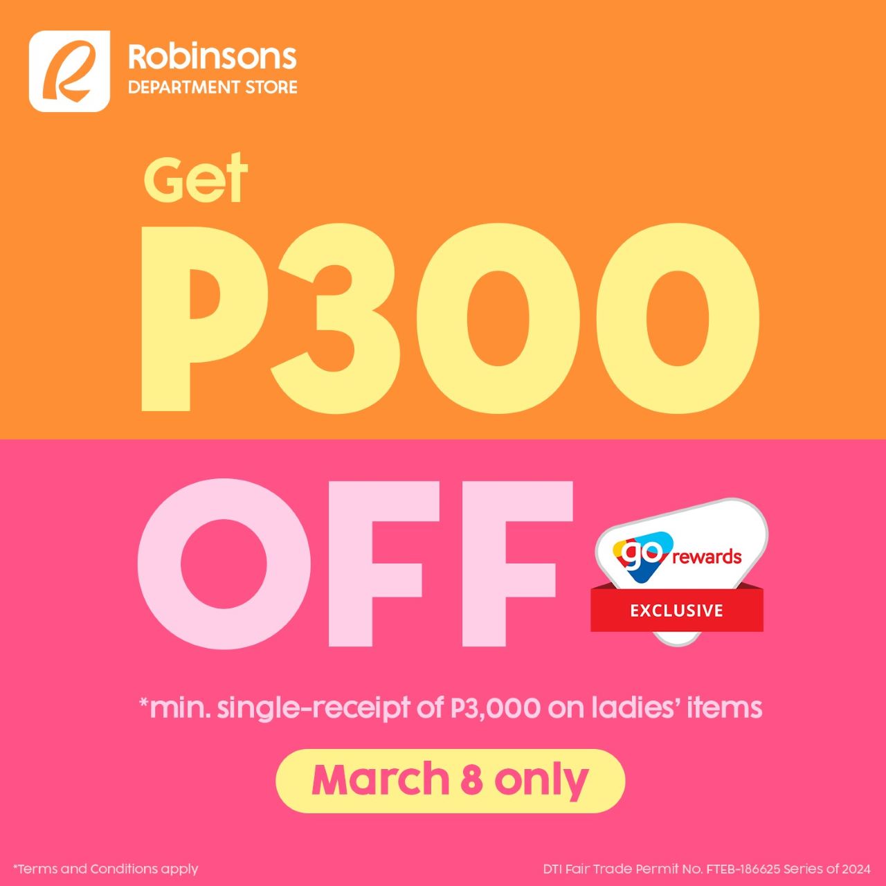 Robinsons Department Store has more promos in store. On International Women’s Day on March 8, GoRewards members can get P300 off on their total shopping for a minimum purchase of P3,000. Snag more great deals at the one-week We Are Women Fair from March 9 to 15 at Robinsons Place Manila Midtown Atrium Activity Center. Get a chance to participate in fun activities, get freebies, and win prizes when you shop.