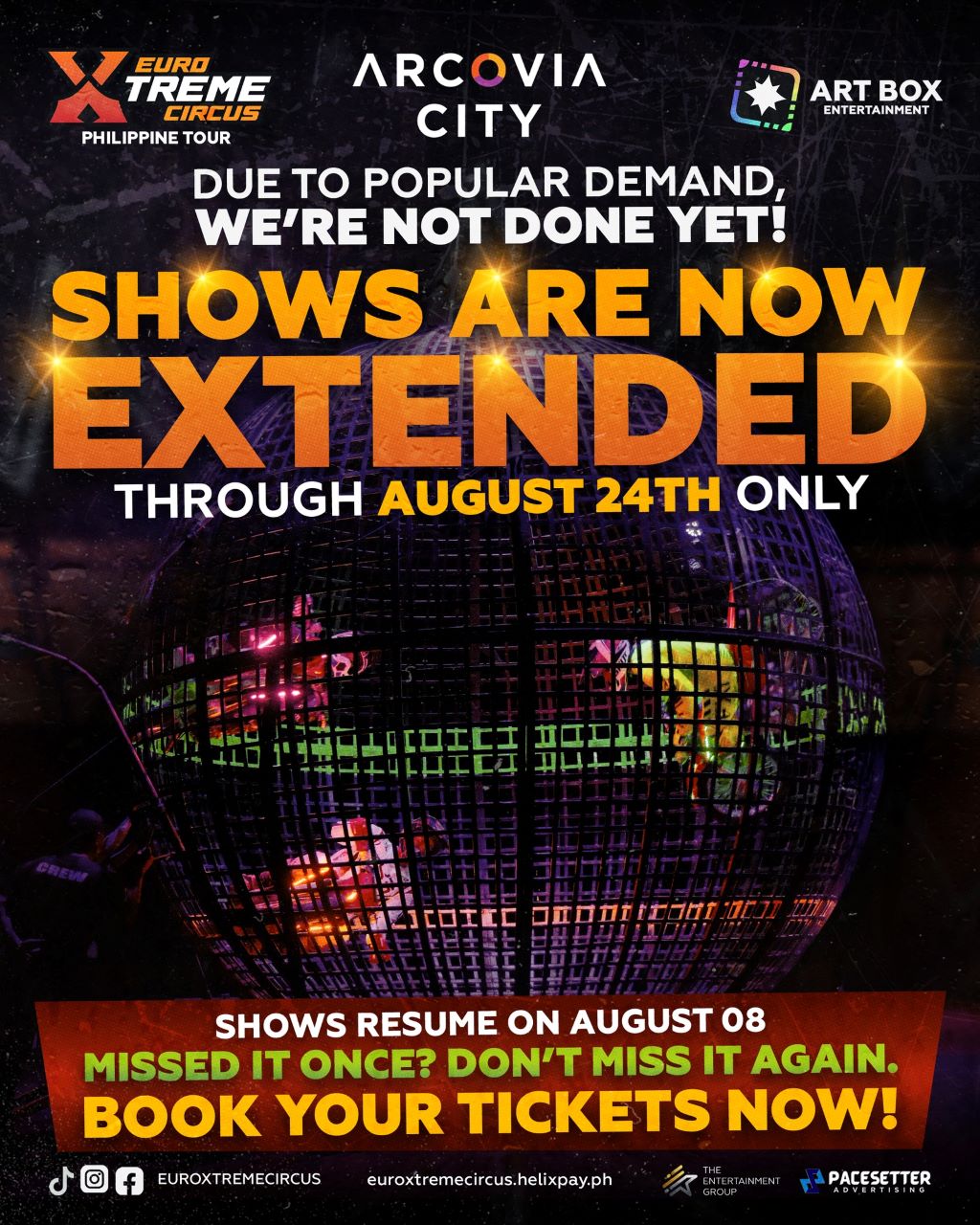 The EuroXtreme Circus brings a world-class spectacle of daring stunts, comedy, and theatrical flair to Arcovia City for a limited engagement. Highlights include the death-defying Globe of Death, where motorcyclists race at breakneck speeds inside a steel sphere, and the soaring artistry of the Flying Trapeze. This two-hour performance combines high-energy BMX stunts, dynamic dancers, and interactive moments designed to captivate every audience member. Due to popular demand, EuroXtreme extended its show dates until August 24, giving guests the last chance to experience an electrifying celebration of skill and spectacle right in the heart of Pasig.