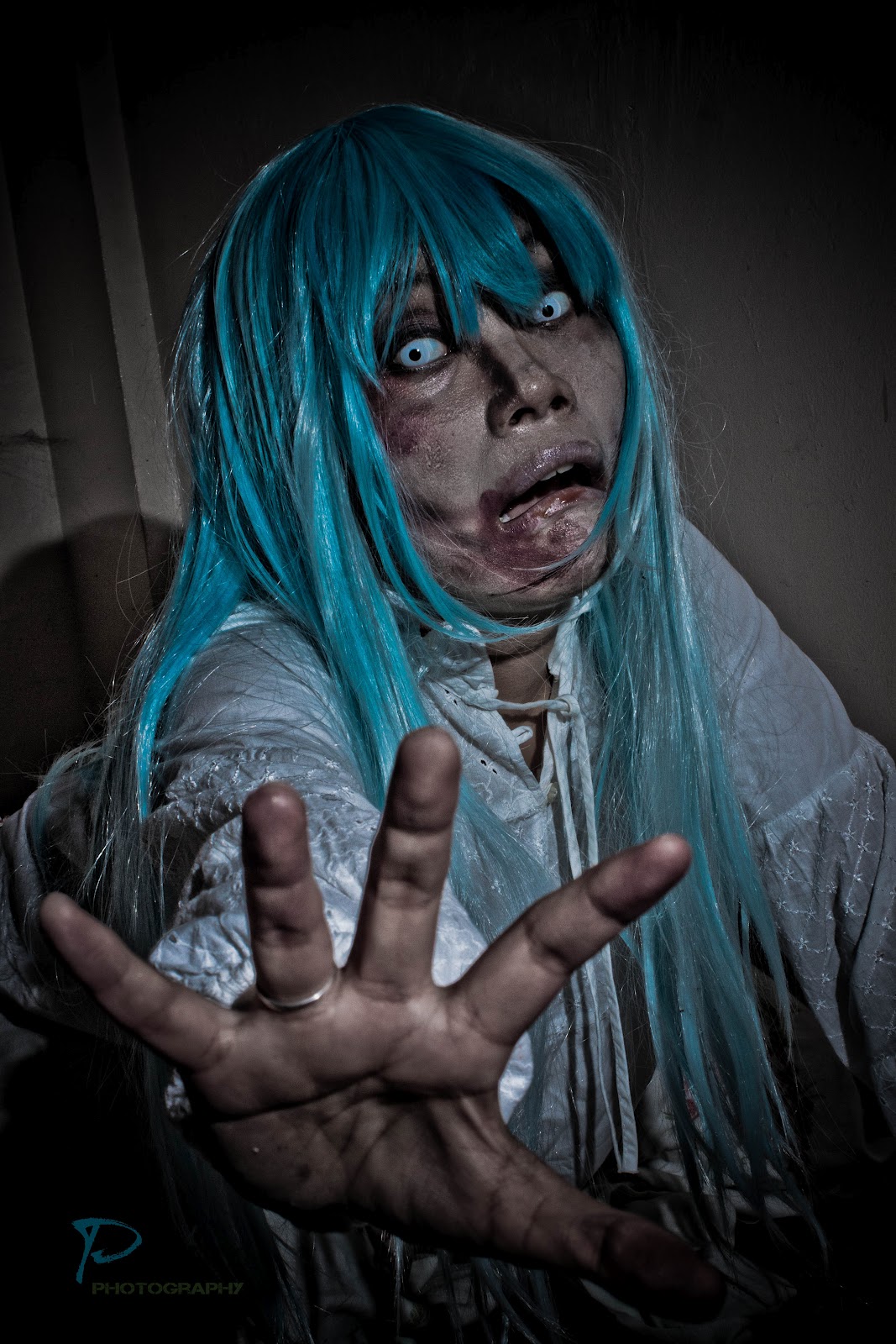 | Evil is lurking. Kaye as the zombie waiting for her next victim. |
