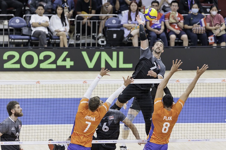 Canada defeated Japan, 25-21, 20-25, 25-15, 20-25, 15-10; Germany, 25-19, 25-18, 25-21; Brazil 26-24, 25-19, 26-24, and the Netherlands, 21-25, 25-22, 28-26, 14-25, 15-9.