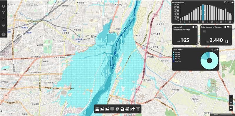 The combined solution uses flood forecasting models and precipitation data to perform sophisticated calculations and visualize flooding, as well as to address challenges and use cases in the medical, financial, public and distribution industries, such as infrastructure damage forecasting, formulation of disaster response plans and estimation of damage amounts. In addition, it aims to secure safe evacuation routes and support infrastructure protection in the event of abnormal weather and natural disasters by leveraging weather IoT sensors and weather forecast services that monitor temperature and rainfall.