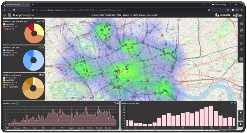 Through a combination of Hexagon’s geospatial visualization tool M. App Enterprise and Fujitsu’s infrastructure services, the companies have developed an application that visualizes areas with high levels of traffic accidents; analyzes traffic volumes, road design, signs and other factors; and provides recommendations for reducing traffic accidents in accordance with the Road Safety Toolkit (Note 2) of the International Road Assessment Program (iRAP).