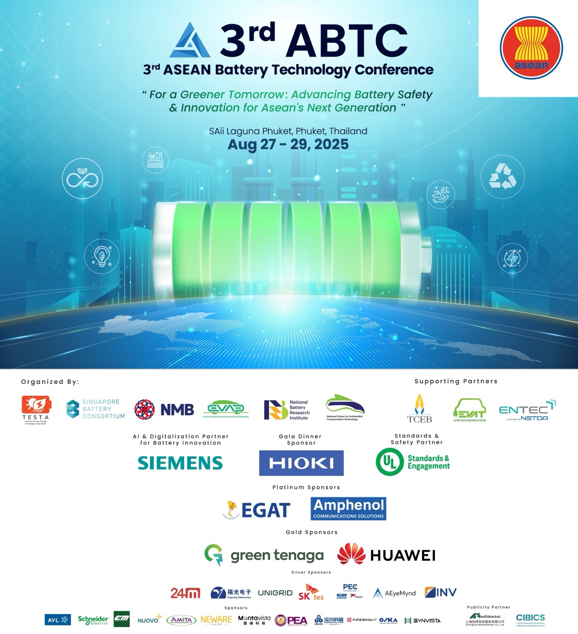 The 3rd ASEAN Battery Technology Conference is made possible with the support of key partners and sponsors. Siemens as the AI & Digitalization Partner for Battery Innovation, UL Standards & Engagement as the Safety and Standards Partner. Gala dinner sponsor Hioki. Platinum sponsors EGAT and Amphenol, Gold sponsors Green Tenaga and Huawei, Silver sponsors PEC Technology, CD Technologies, Trojan, Fuguang Electronics, SK tes, UNIGRID, 24M and INV Corporation and Sponsors AVL and Nuovo Plus. Supporting partners Thailand Convention & Exhibition Bureau, Electric Vehicle Association of Thailand and National Energy Technology Center.