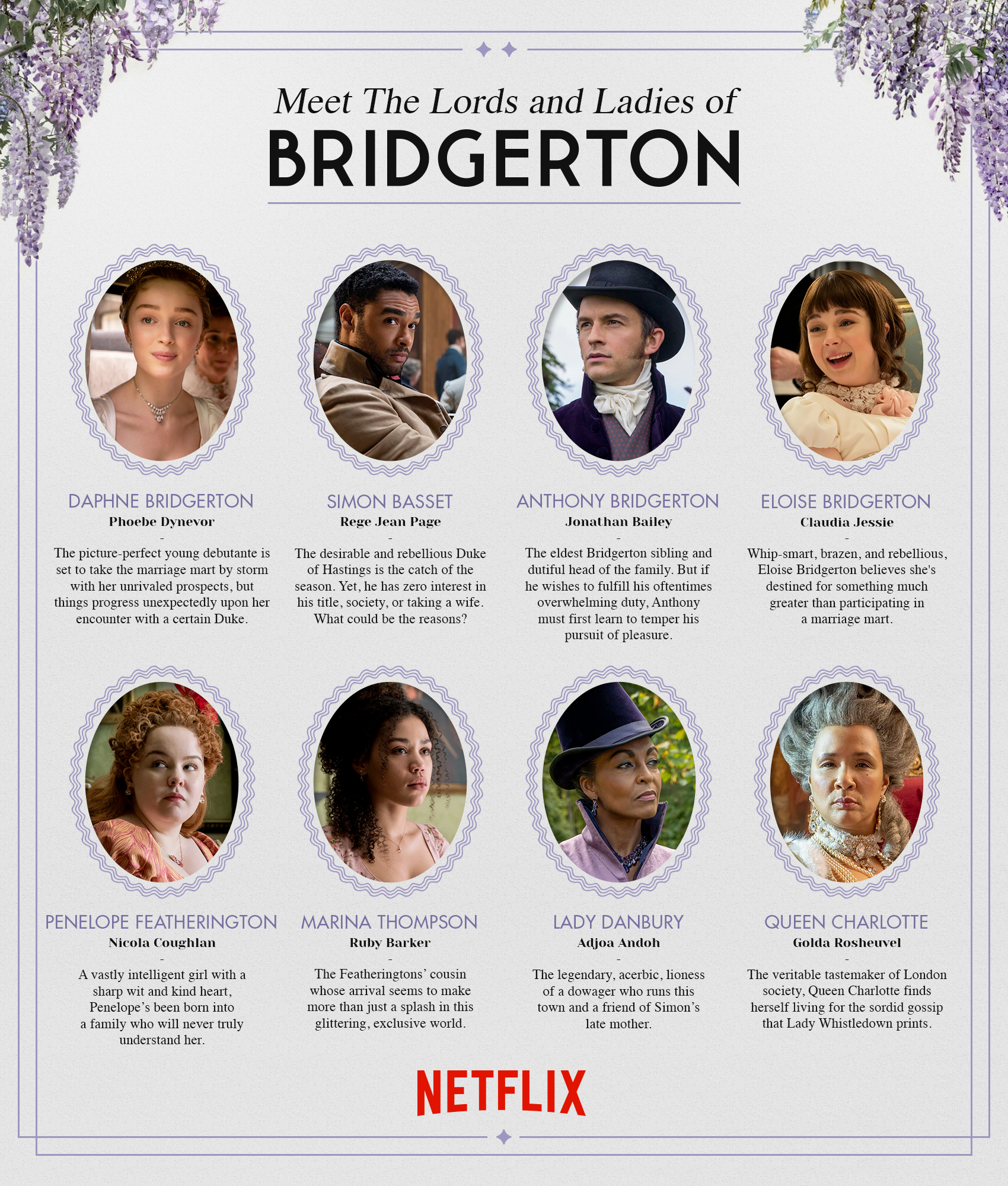 If you have a taste for glamour, swoon-worthy romance, and juicy scandals, then count the days until the release of Lady Whistledown’s society paper in Bridgerton. The mysterious lady, voiced by the award-winning actress Julie Andrews, will share what’s really happening behind closed doors in the reimagined Regency London’s high society life, where everyone’s reputation is at the mercy of her pen. While we’re waiting for her to name names like Gossip Girl/Dan Humphrey on Christmas Day, meet the lords and ladies in Bridgerton who might be on her surveillance list.